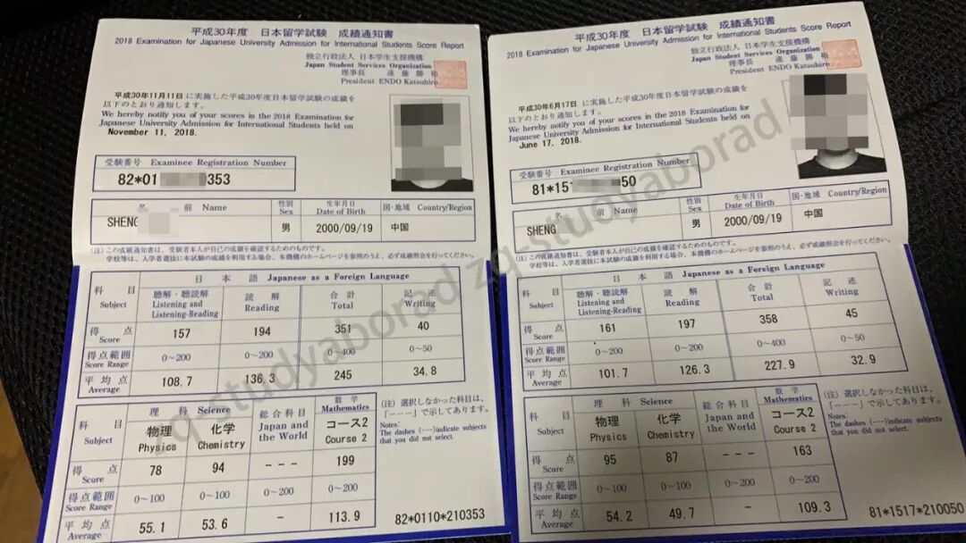 曾报名考过两次EJU(2018年6月份香港考场和2018年11月份京都考场),都取得了不错的成绩,6月份的物理,11月份的数学、化学均为满分!!!