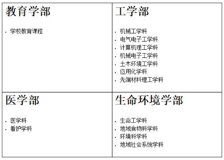 学校本科专业设有工学部,教育学部,医学部,生命环境学部这四大专业。